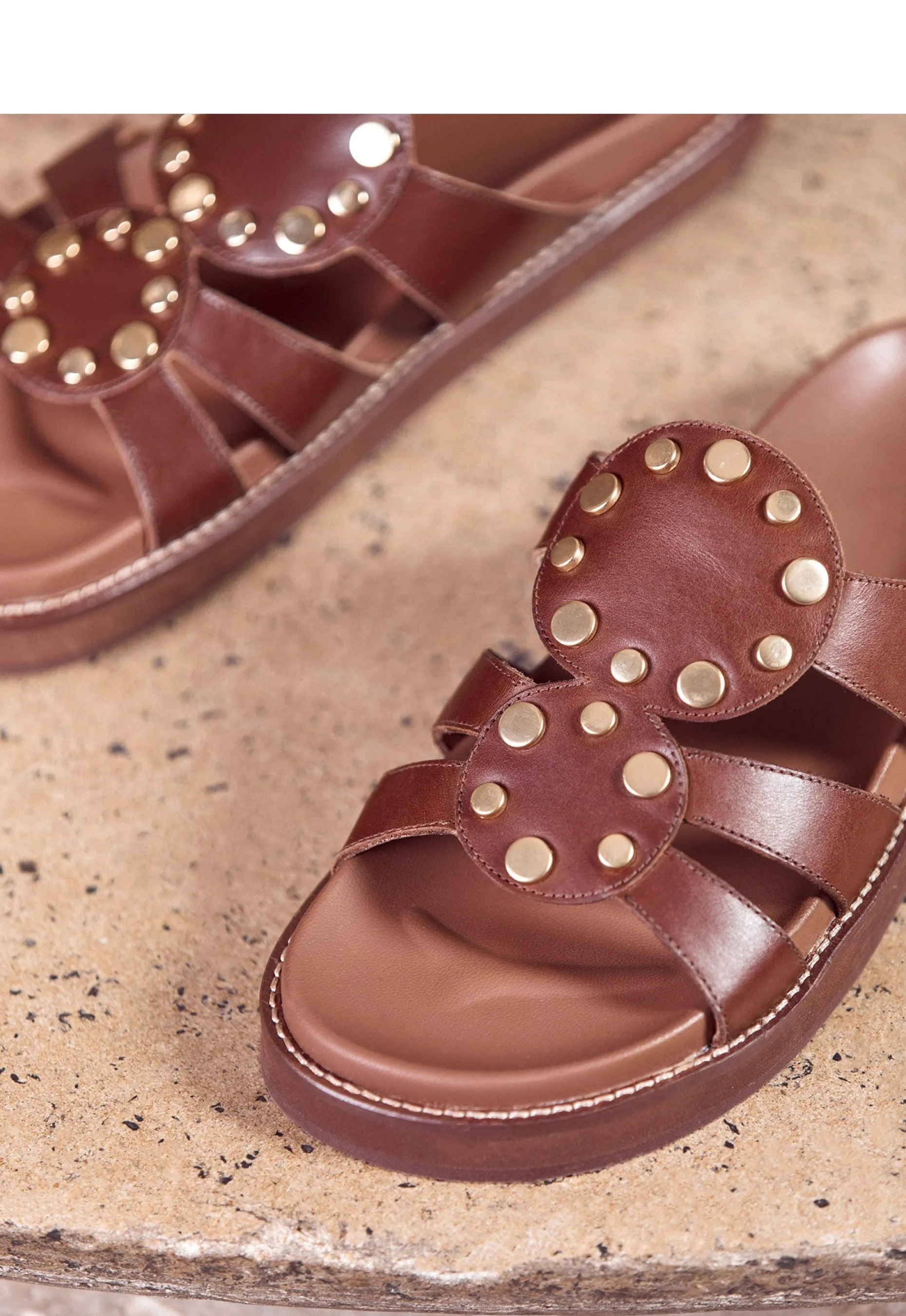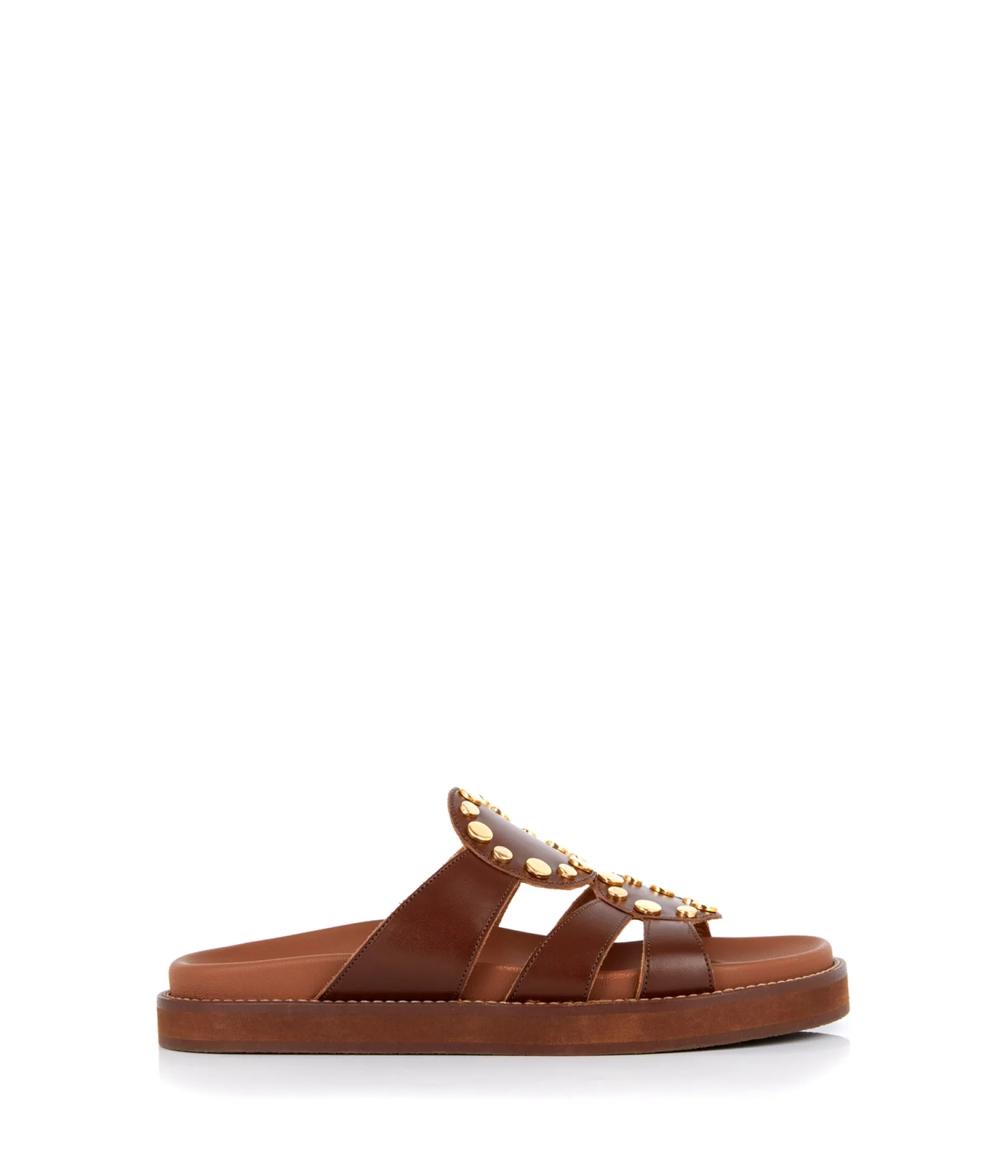Sur une plage d’Ibiza (oui ,vous avez piqué les plans vacances de JM Blanquer), d’Hydra ou dans les calanques marseillaises (pour celles qui checkent leur bilan carbone), vous aurez la paire à instagramer. Elle s’appelle Ana : cuir terracotta, clous dorés et célébration de l’été.