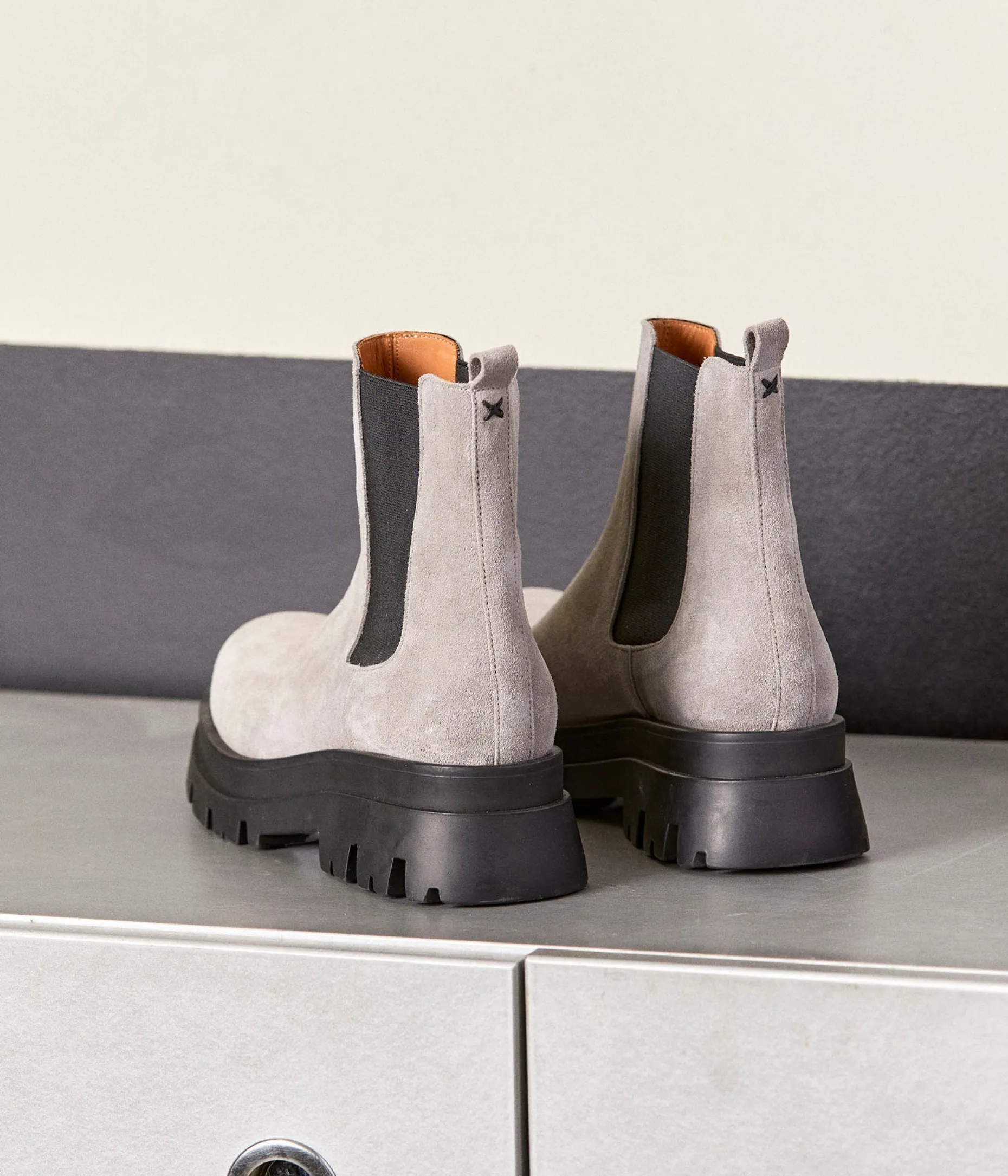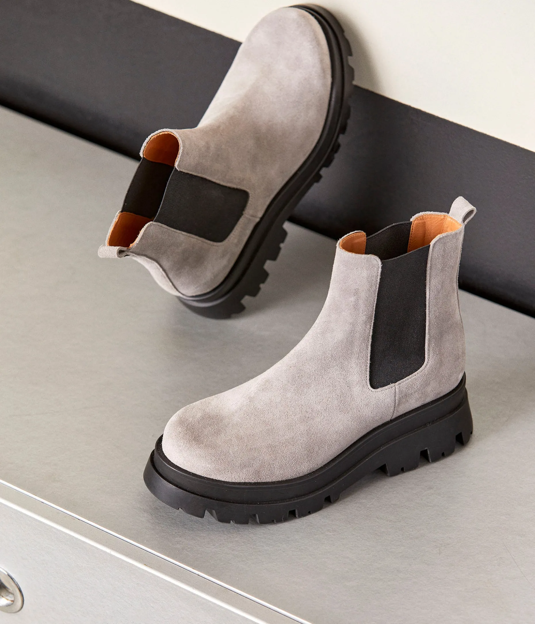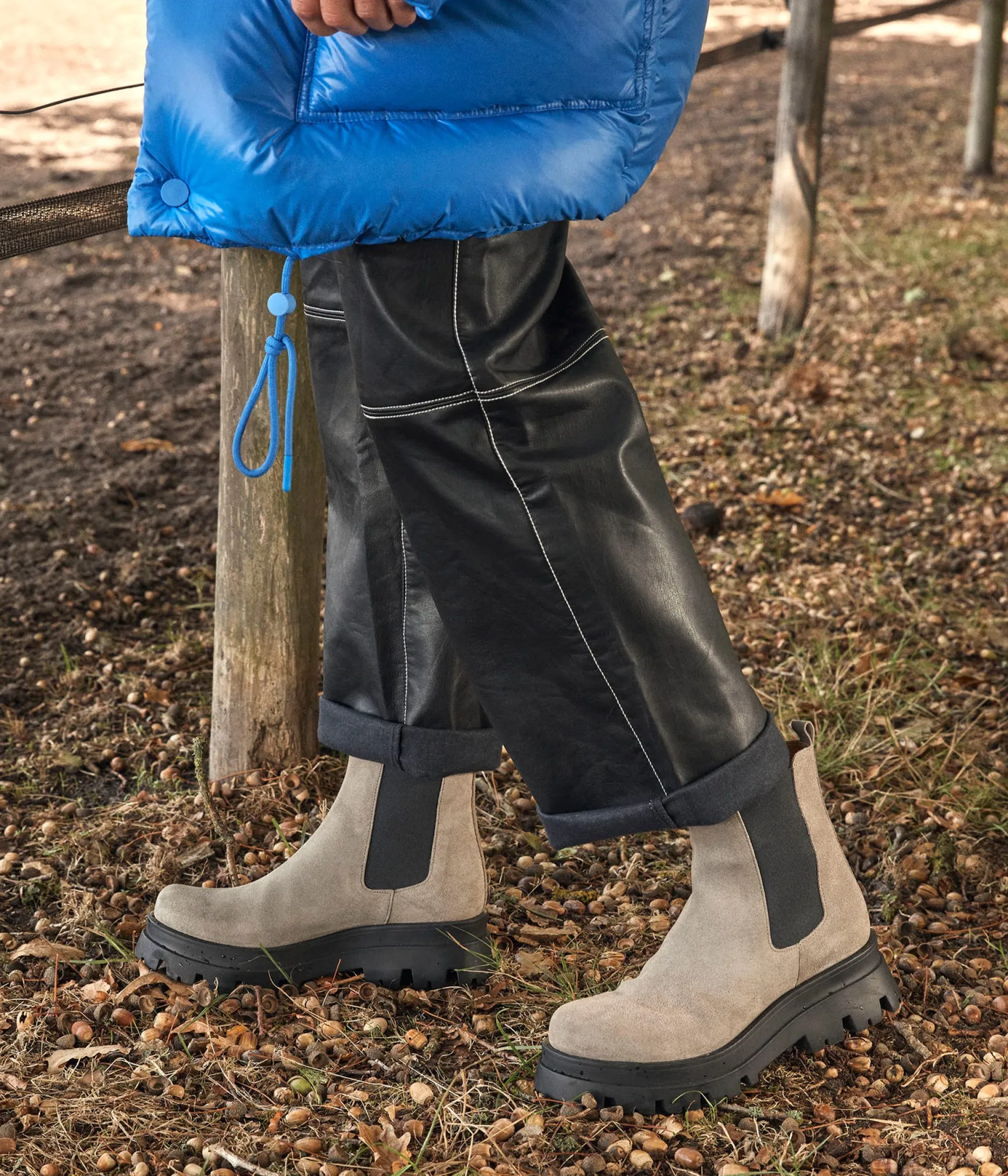 Se chausser est encore un plaisir accessible, dont on ne peut pas se passer. Surtout en plein hiver (clin d’œil, ndlr). Observez les Chelsea boots Lia. Cuir velours taupe et semelle épaisse crantée, difficile de trouver plus réconfortant. Peut-être un plaid et une série Netflix sur le canapé ? Faut voir.
