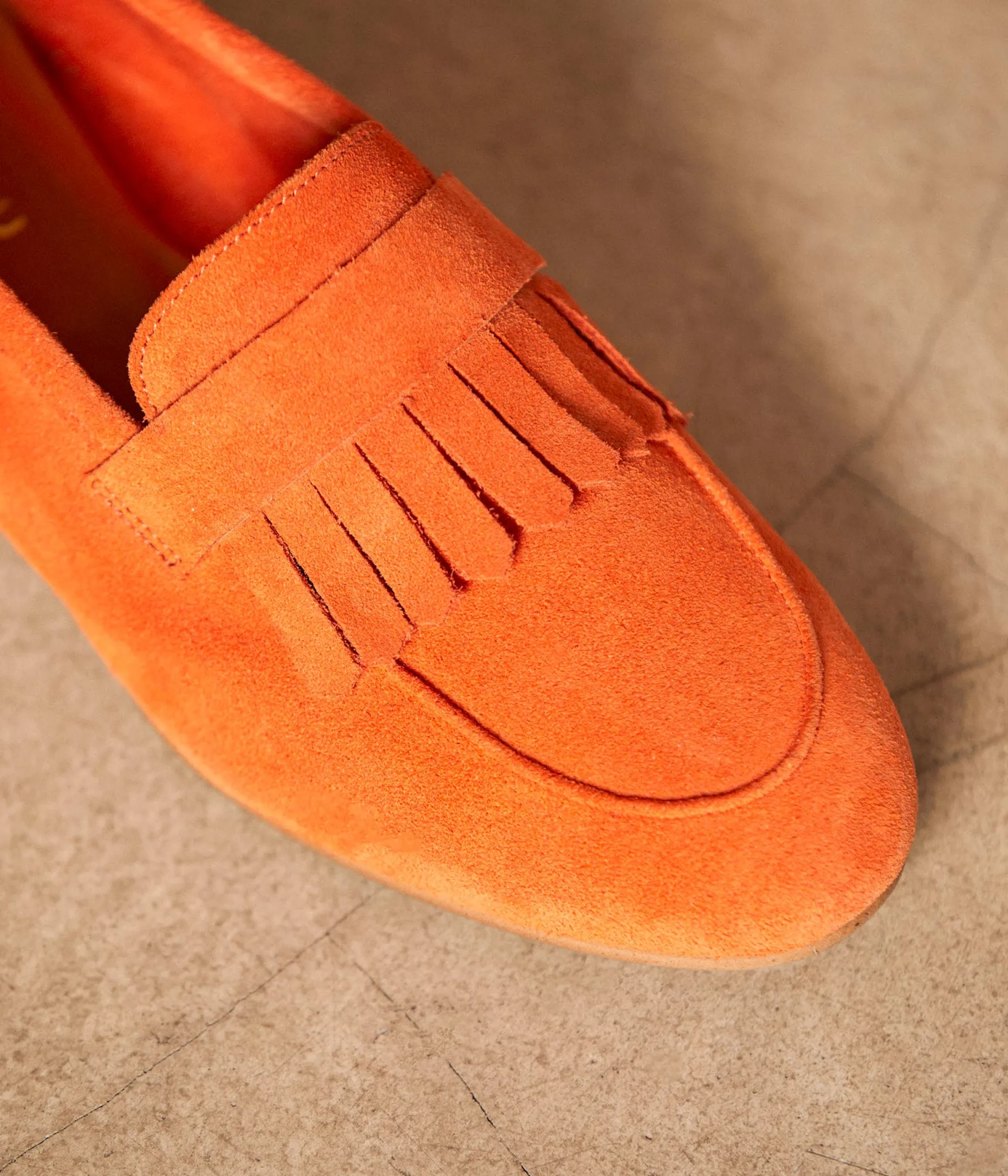 Impossible de savoir qui a volé, a volé, a volé, a volé… l’orange du marchand. Par contre, on sait désormais sur qui jeter son dévolu, en ce qui concerne les it-shoes de la saison. Prenez note ! Mocassins, Jamie, cuir velours, patte frangée.