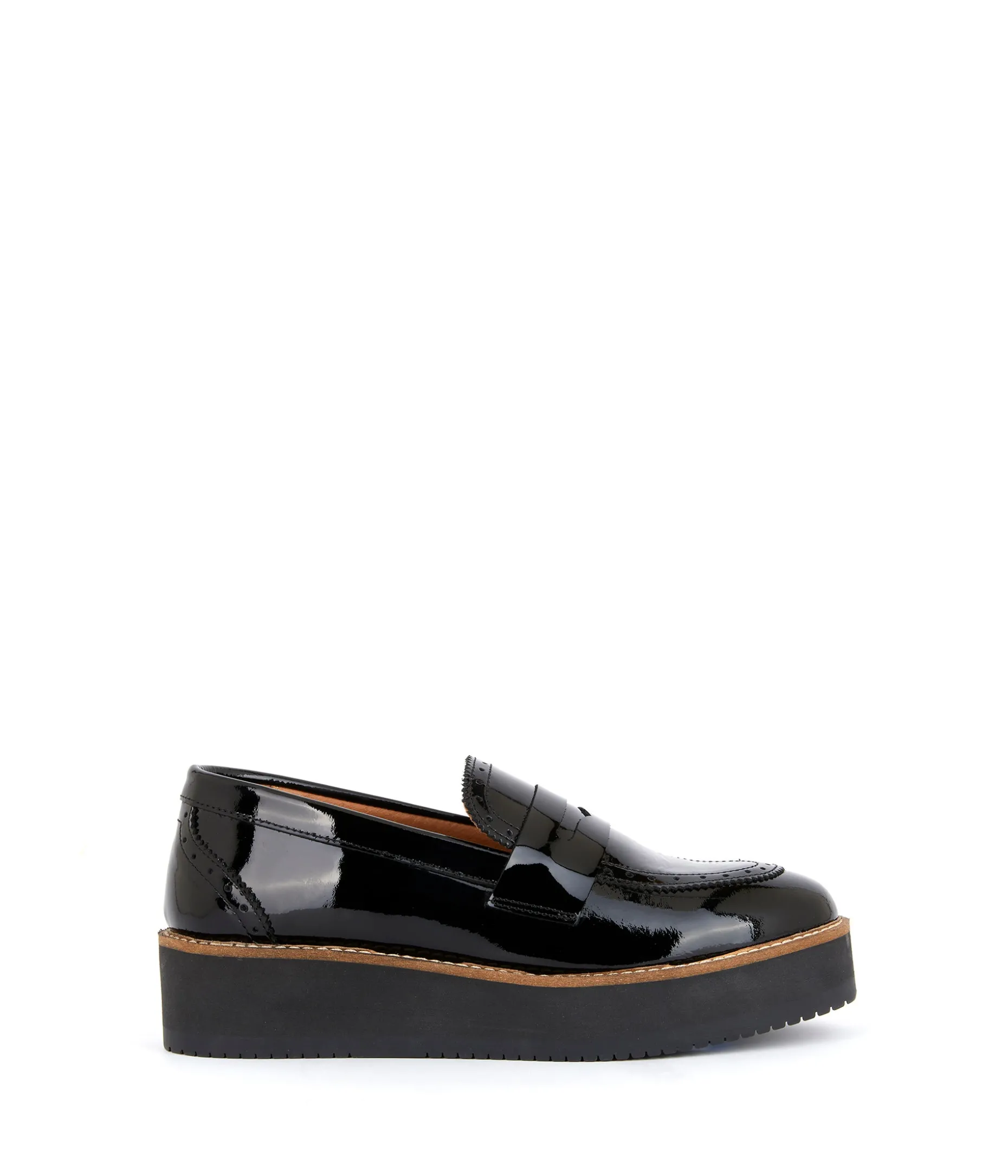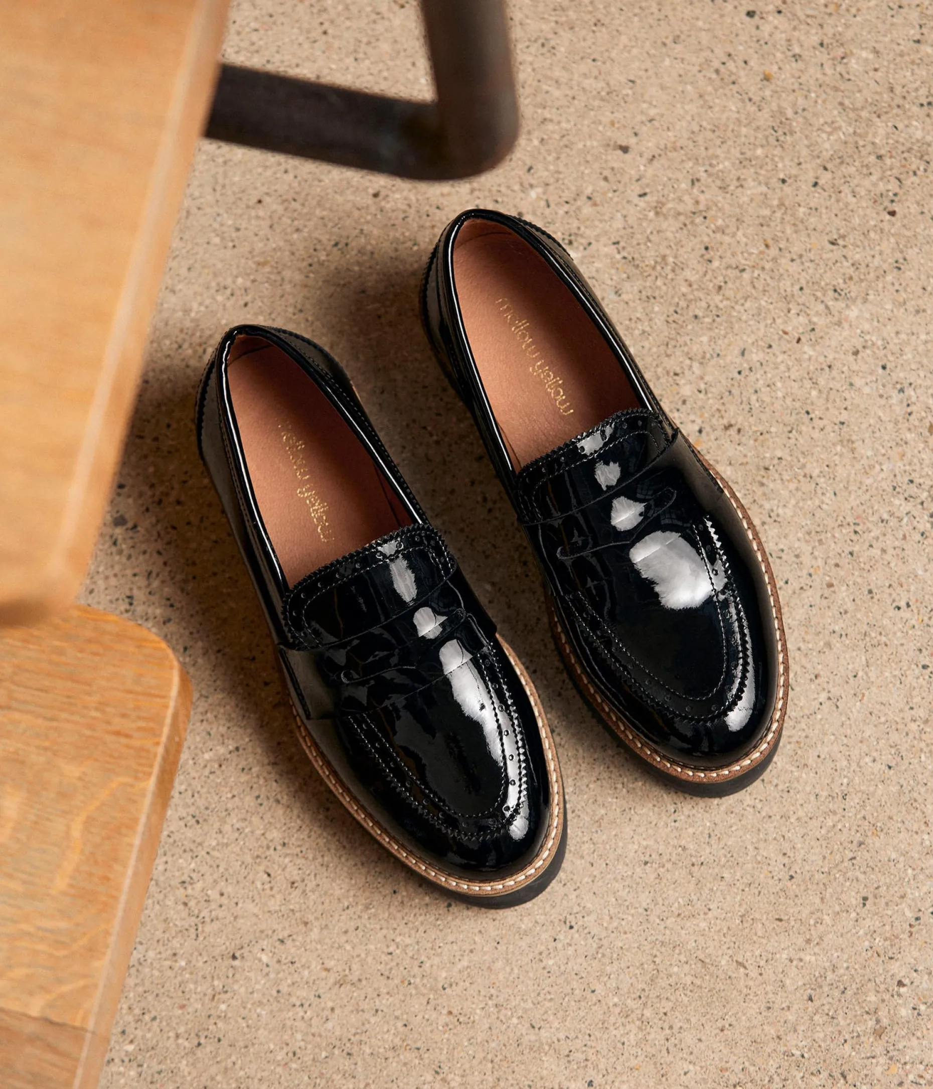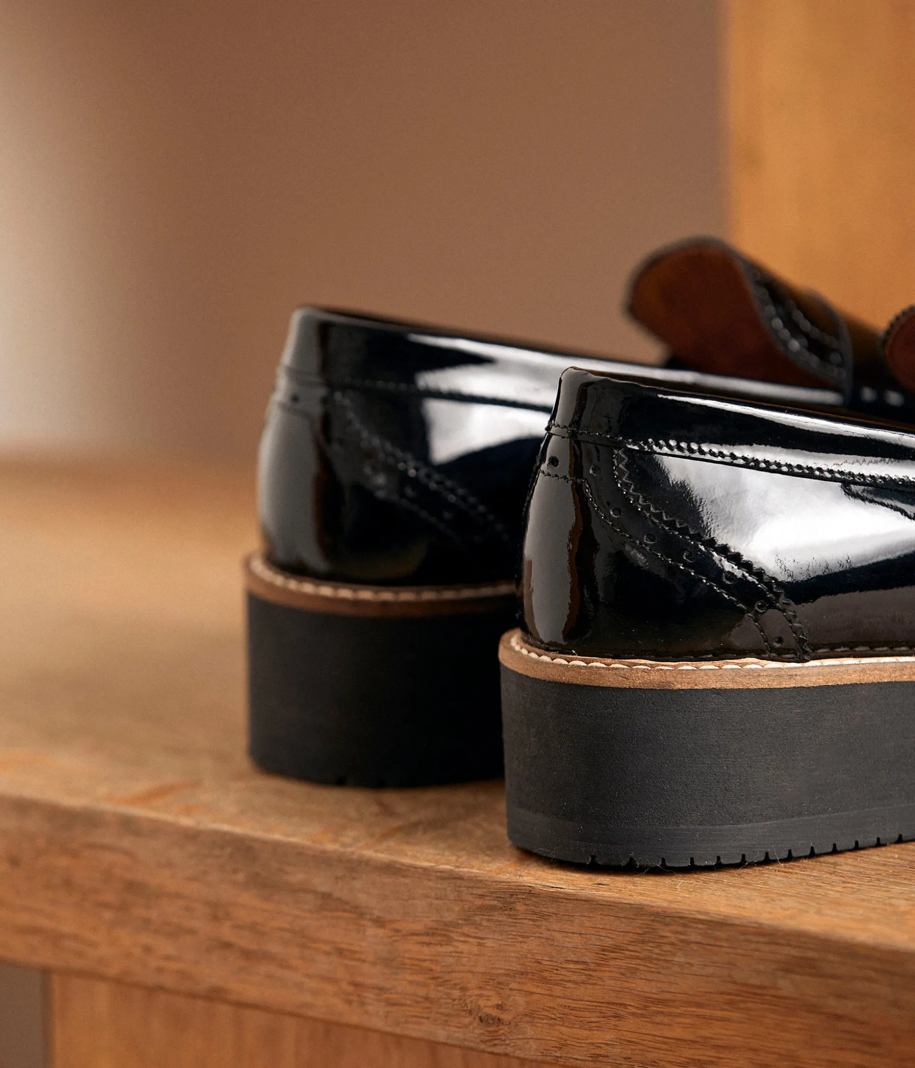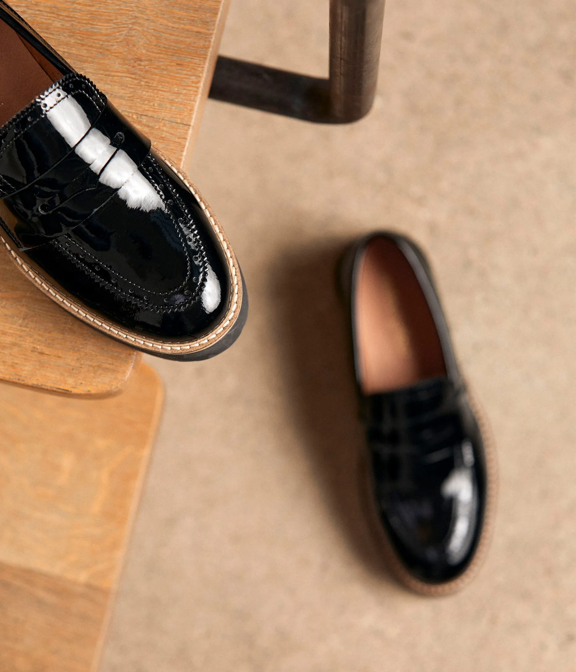 On assume le noir verni. Élégant, clinquant, il règne en maître cet hiver et prend tout son sens pour le soir. Afin de le sortir de son carcan tradi, on le porte en mocassins à plateforme, rythmés de perforations. Caliope, c’est LA touche so 2023.