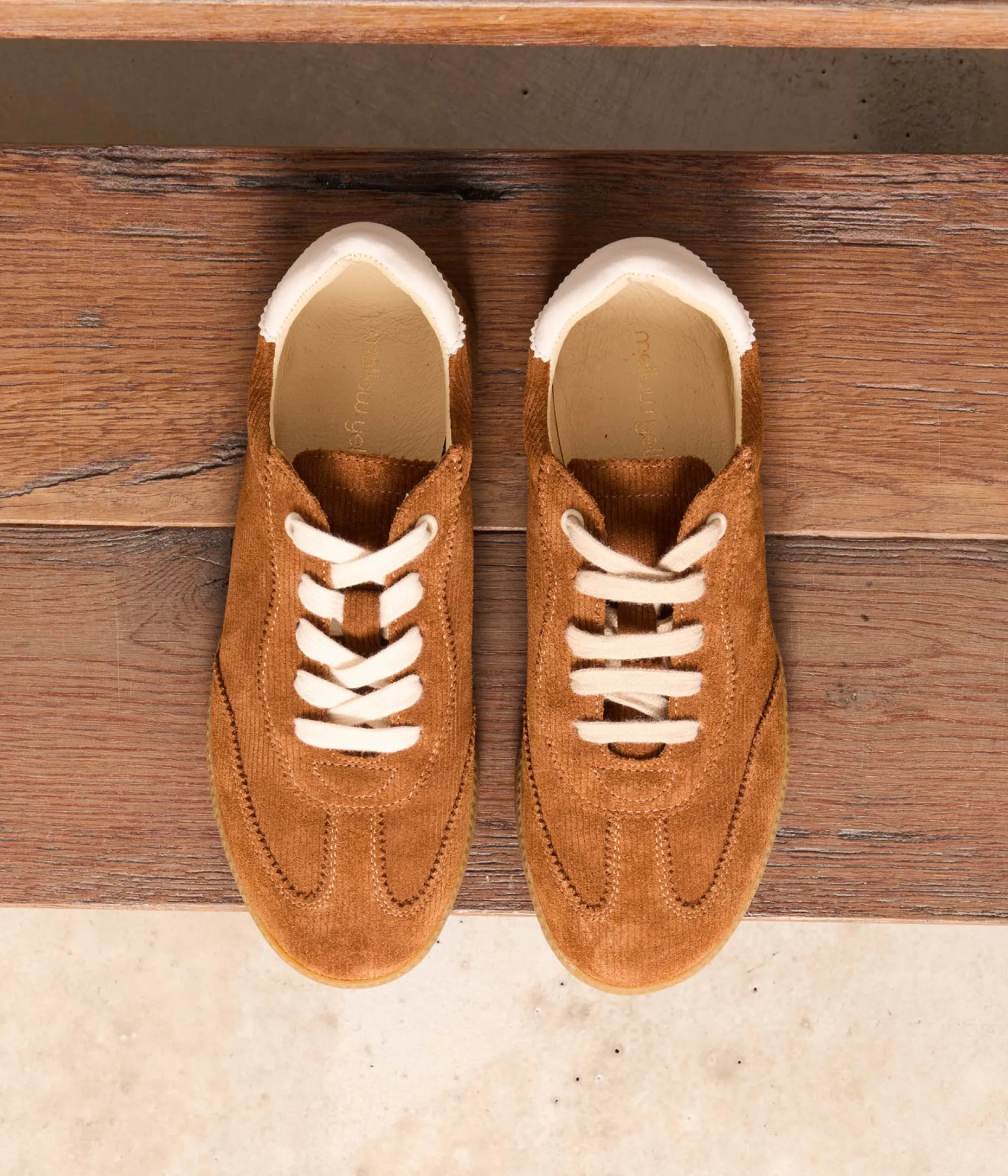 Allier confort et style : mission impossible ? Les baskets Simon défie les on-dit en ouvrant le champ des possibles. Revisitées en cuir velours et coloris camel, elles appellent un total look en denim brut, un survet’ en maille vert bouteille, un cardi parme sur une jupe midi prune. Ça frise le génie, non ?