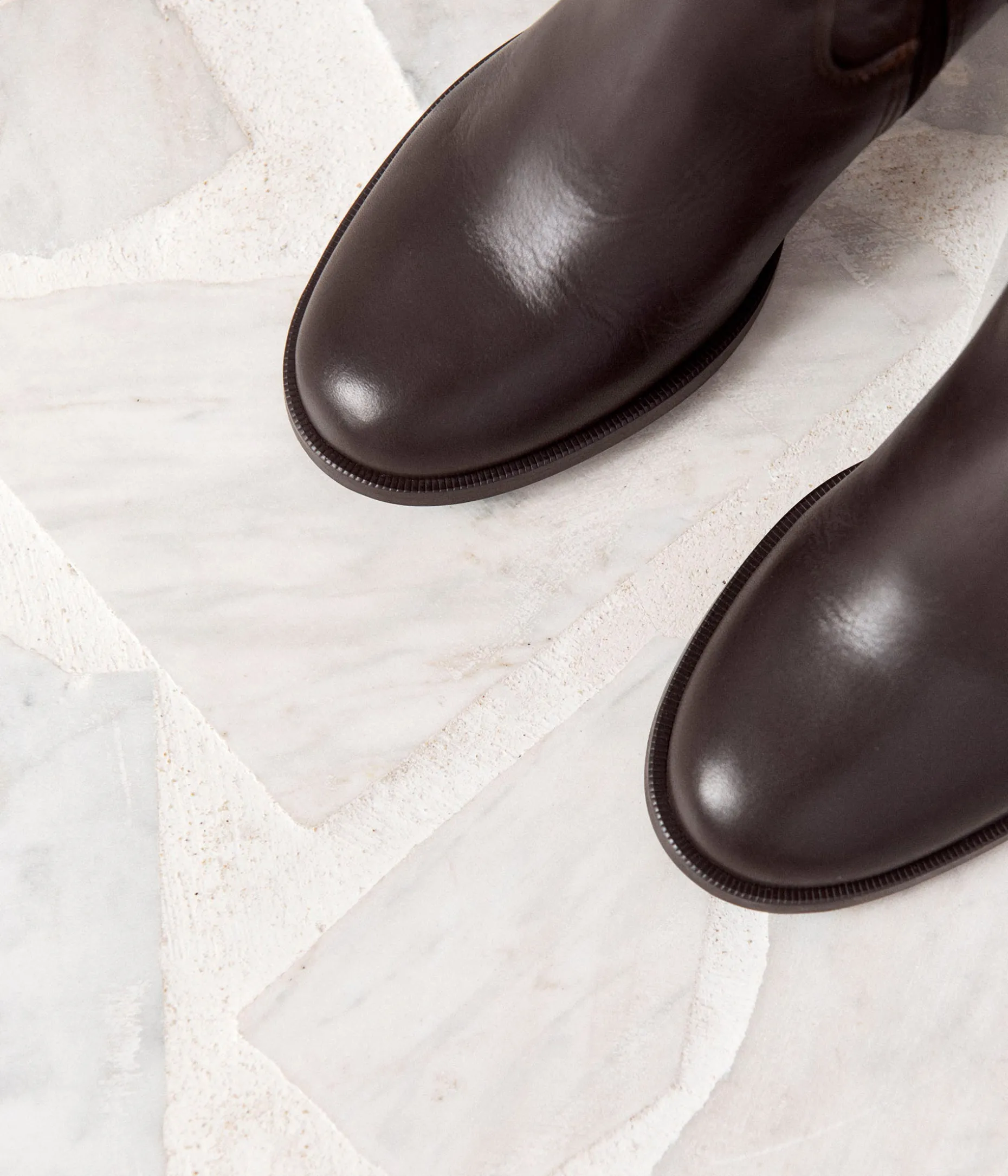 Une tige de cuir marron montant sous le genou, un talon de 7cm et un élastique au mollet pour allier le confort à la classe – sinon à quoi bon ? Vous voilà hyper bien dans vos bottes Sophie pour mieux conquérir le monde.