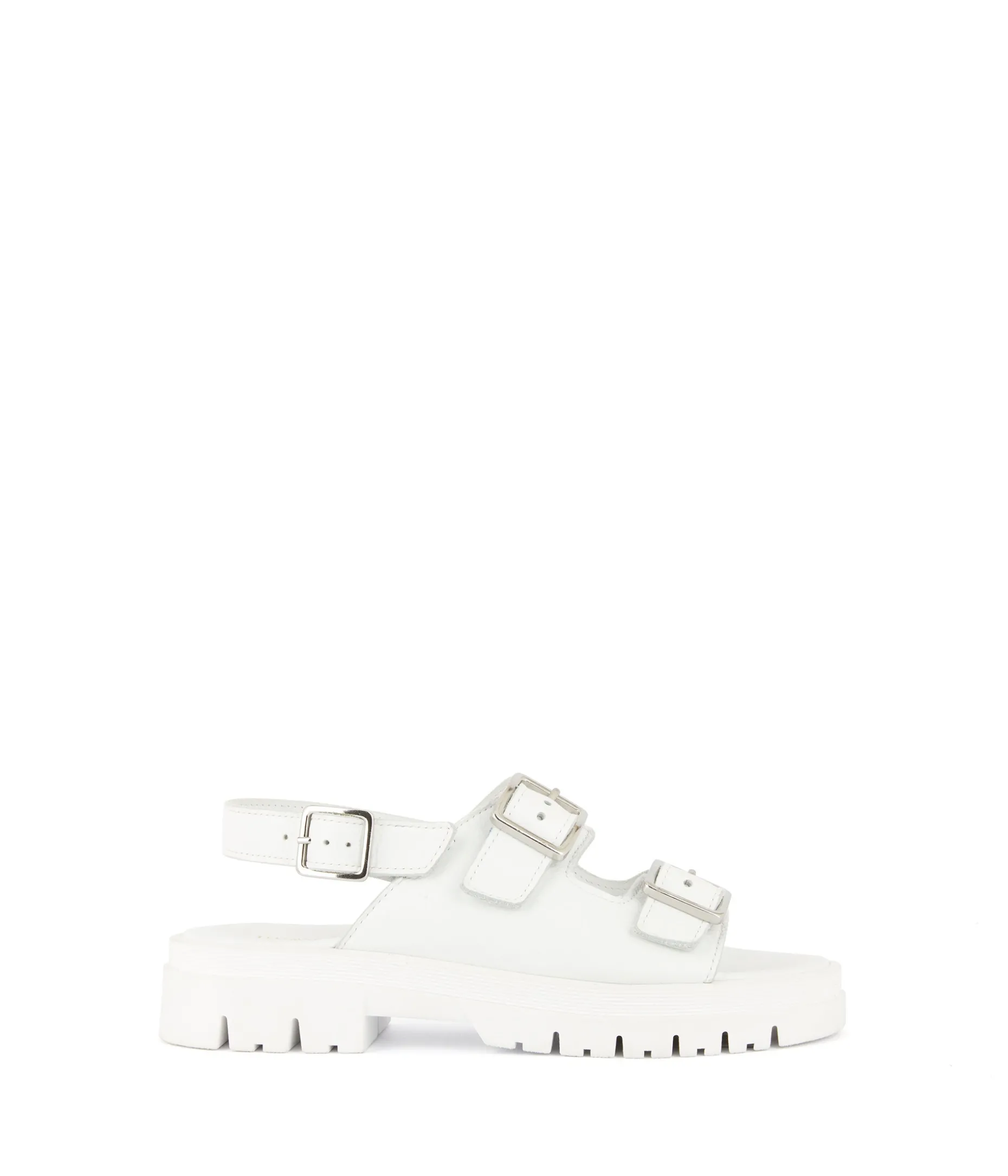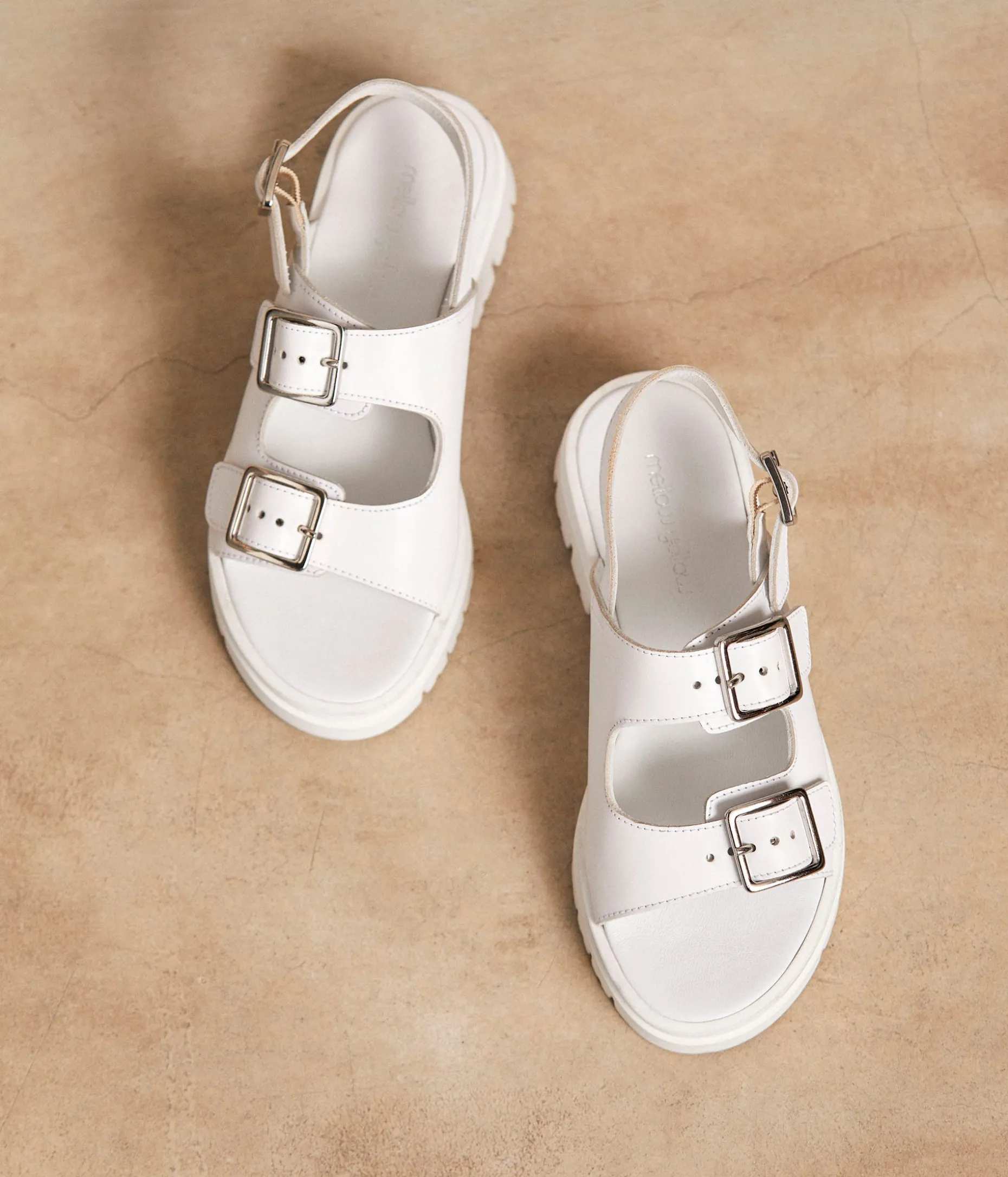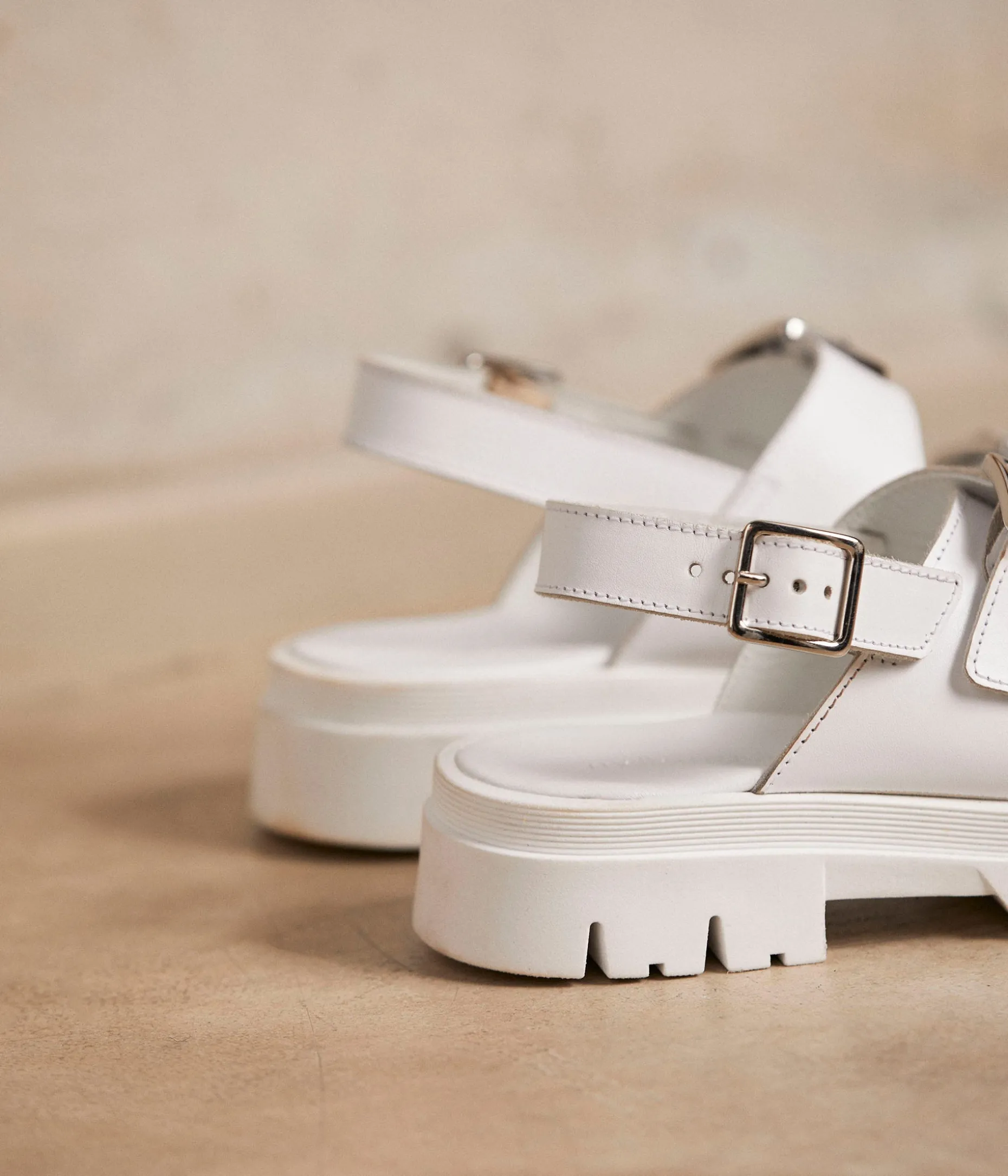 Amplifier les volumes. Superposer les styles. Voilà des gestes chics et cool, pour une maxi dégaine, pile l’air du temps. Les sandales Noélie en cuir blanc ne diront pas le contraire. Larges brides sur semelle crantée, elles défient la mode d’aujourd’hui, pour longtemps.