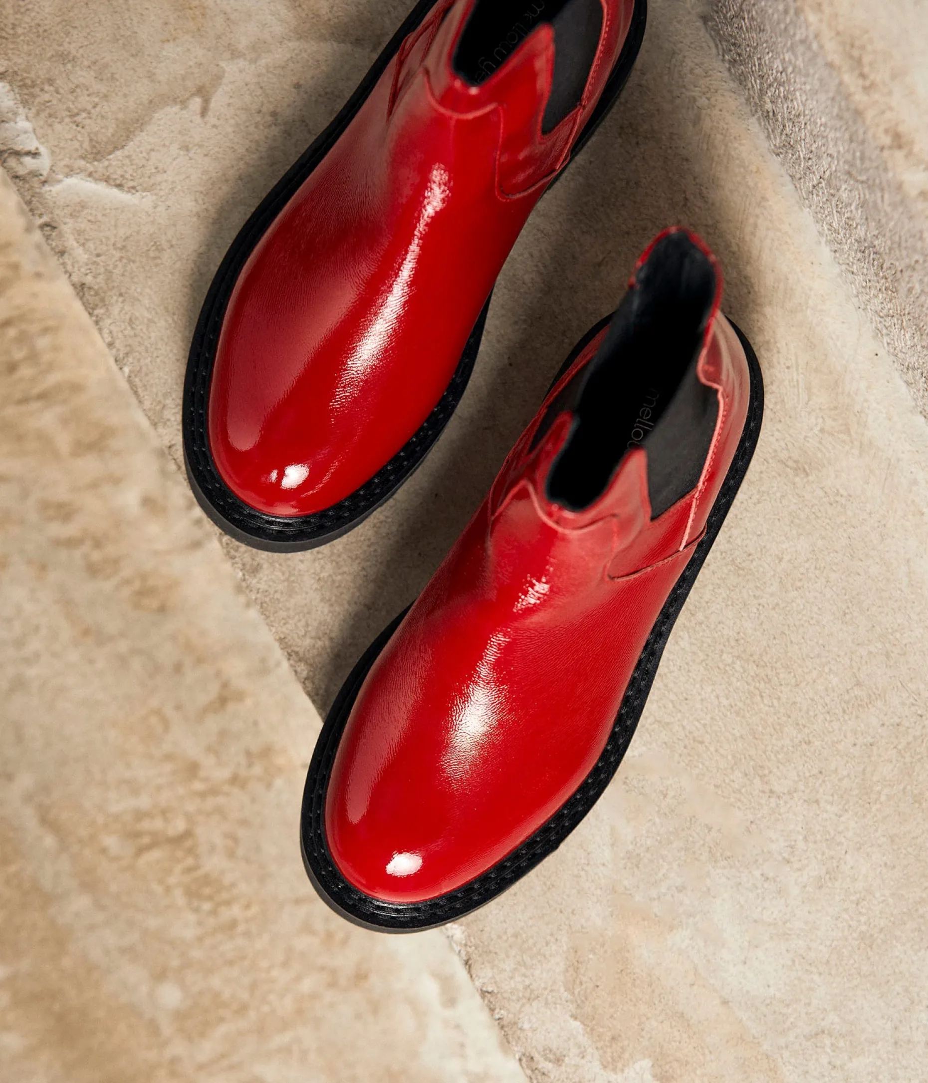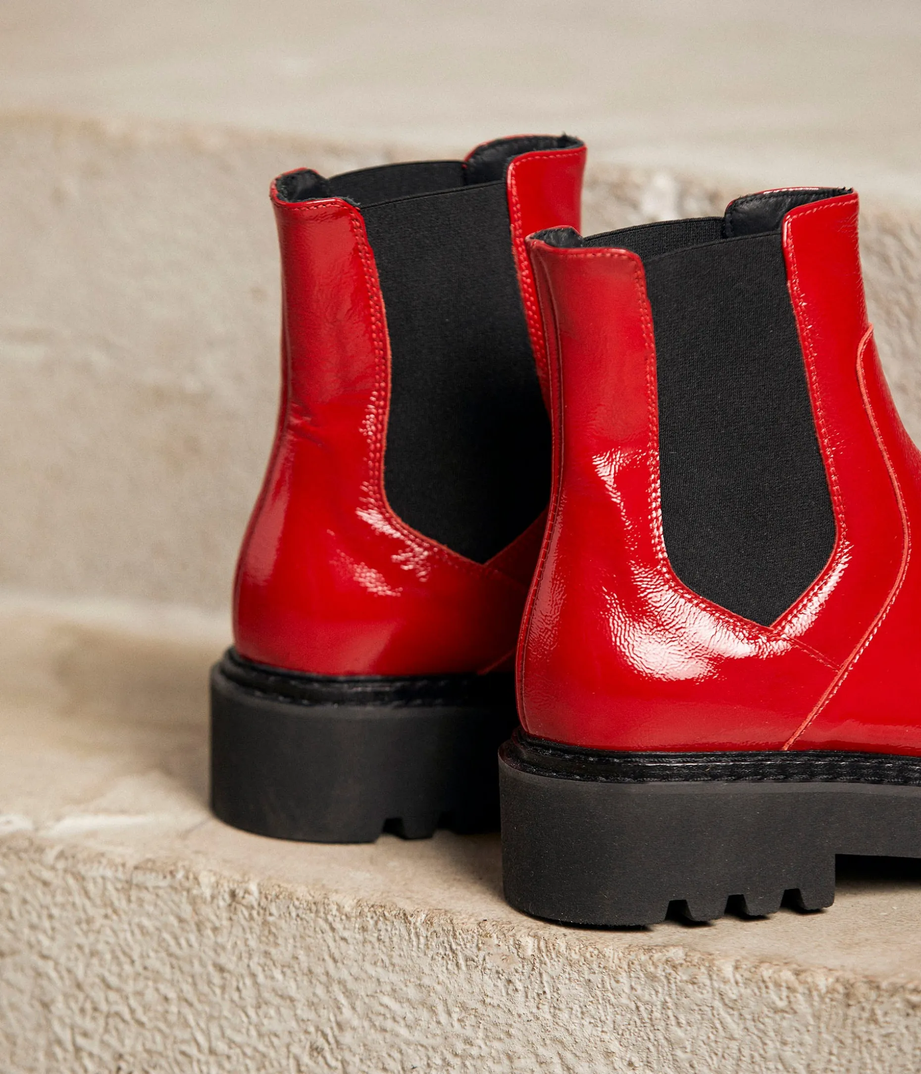 Rouge comme… une pivoine, une tomate, une écrevisse… Et rouges comme les boots Nadège aussi. 4,5 cm de semelle crantée, du cuir verni froissé et un zip intérieur, avec elles, le vent vous portera (et la chanson dans la tête, c’est cadeau!).