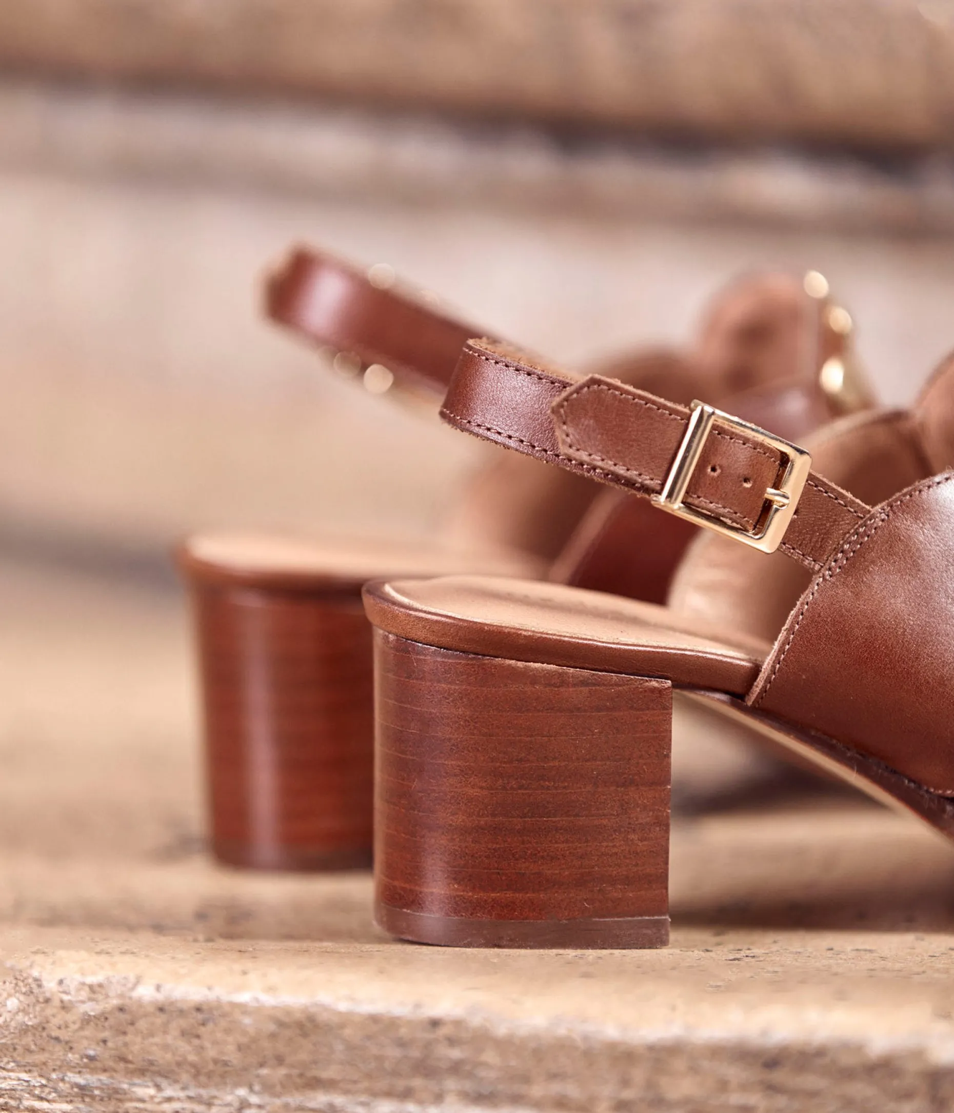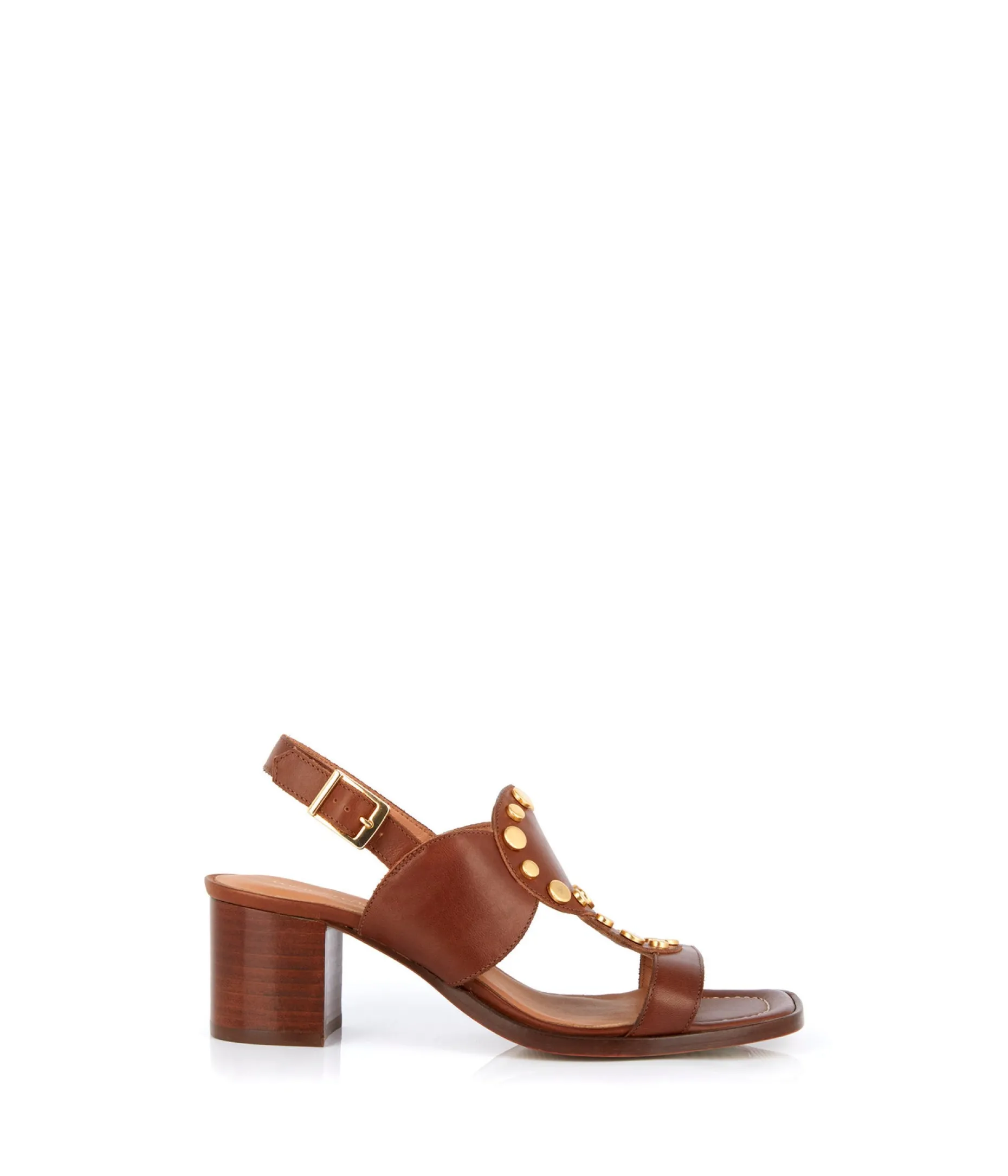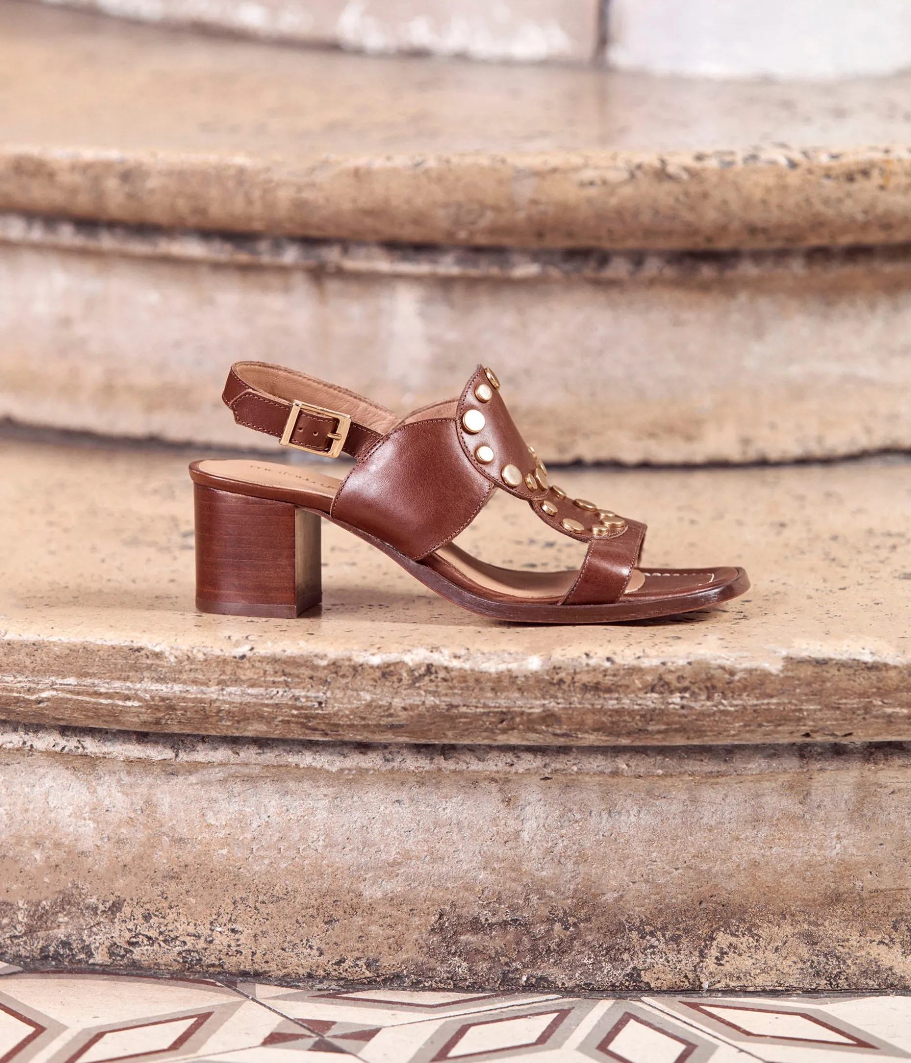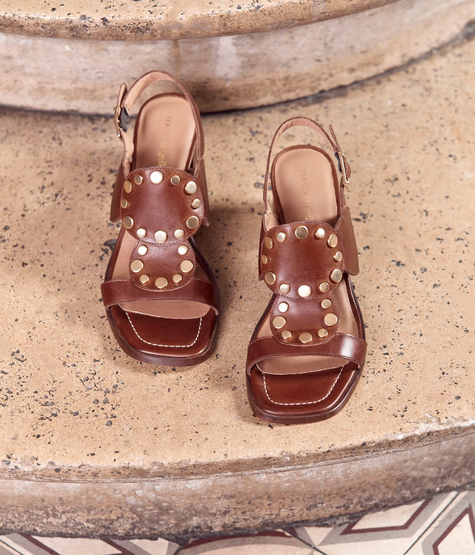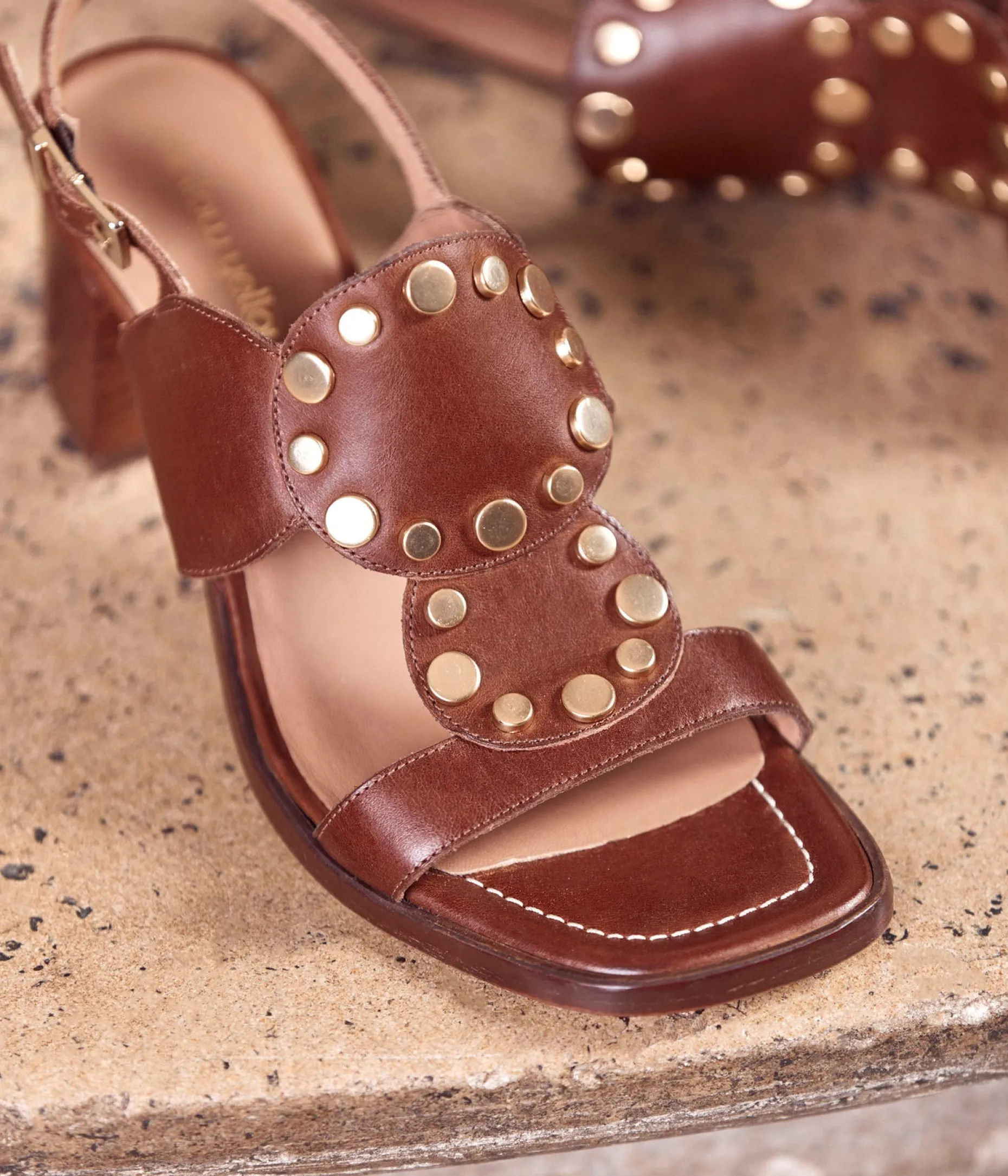 La bohème, la bohème, ça voulait dire… vous dans une paire de sandales Maya à talons marrons et petits clous chics. À porter avec une longue robe fluide, celle des meilleures soirées d’été.