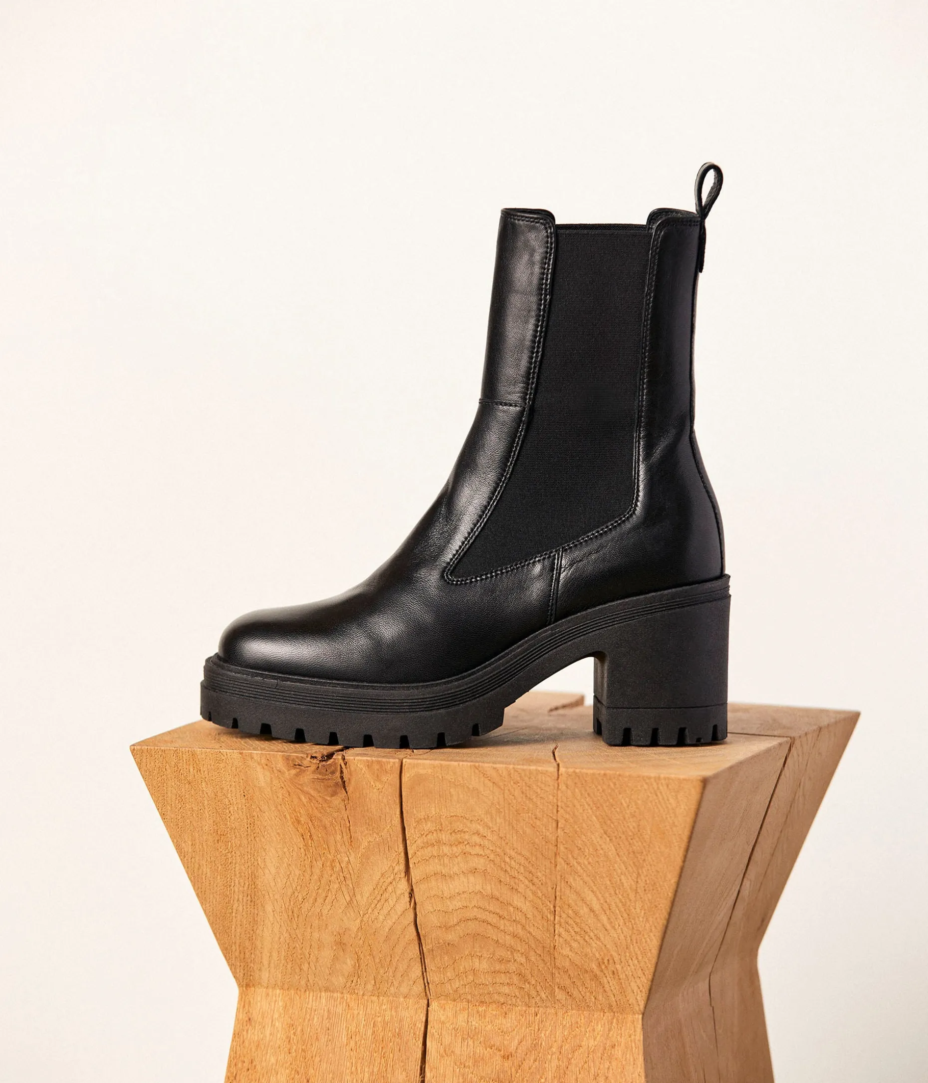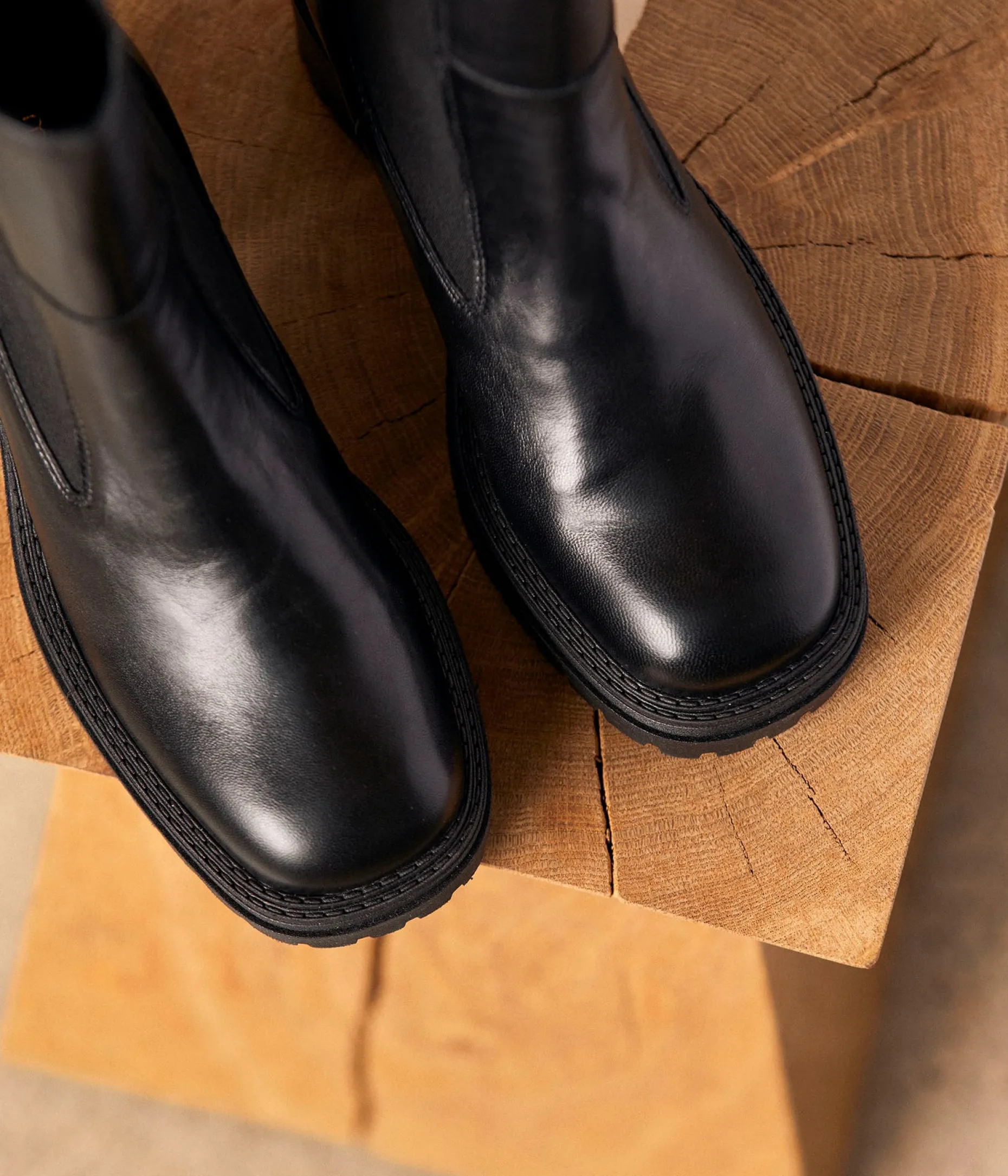 Montée sur ressorts, ou plutôt sur une semelle crantée de 8cm de haut, vous aurez toute la latitude de ne pas tenir en place avec votre paire de chelsea boots Alix en cuir noir. Peur de ne pas avoir la patience de les enfiler? Pas de problème, on a prévu le coup avec le double élastique.