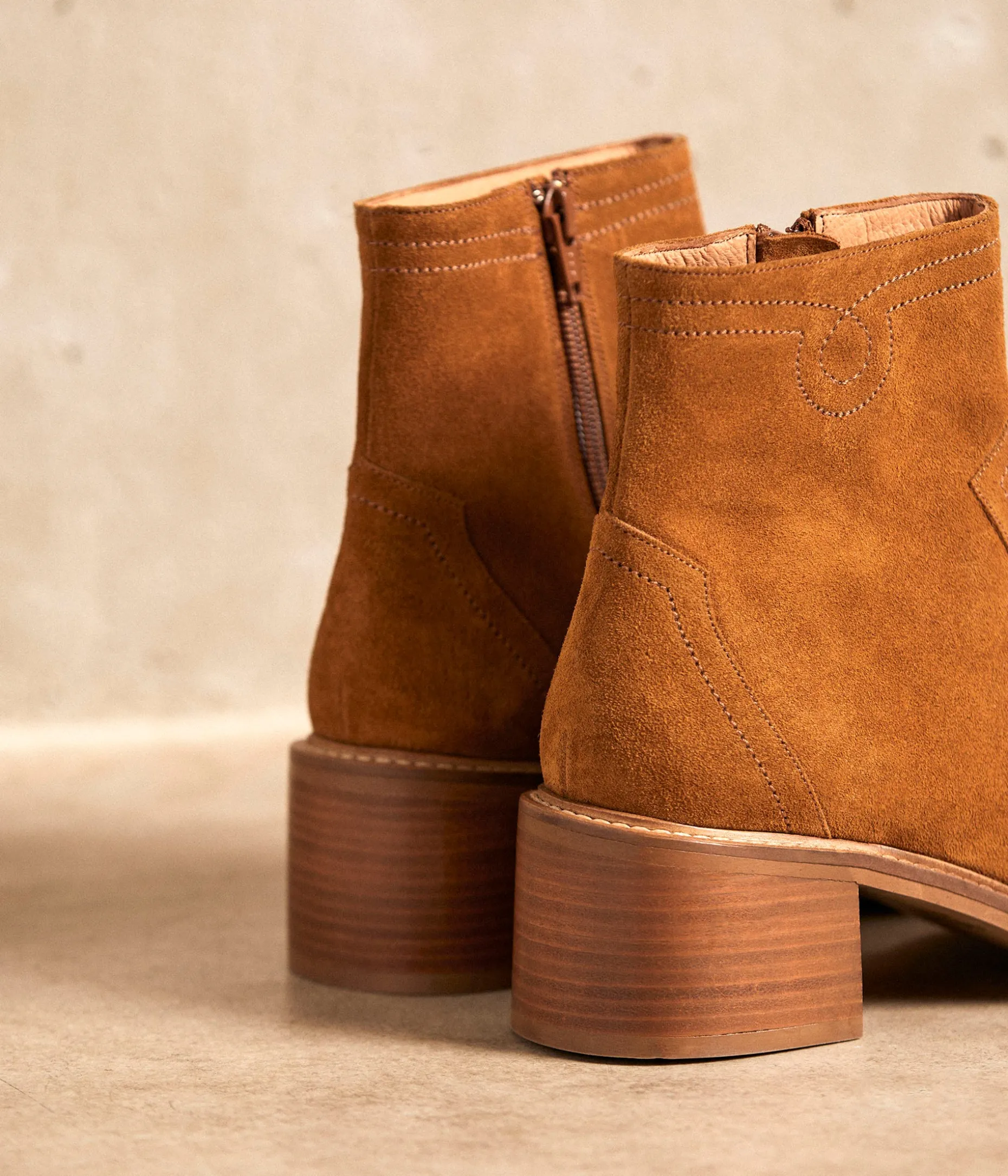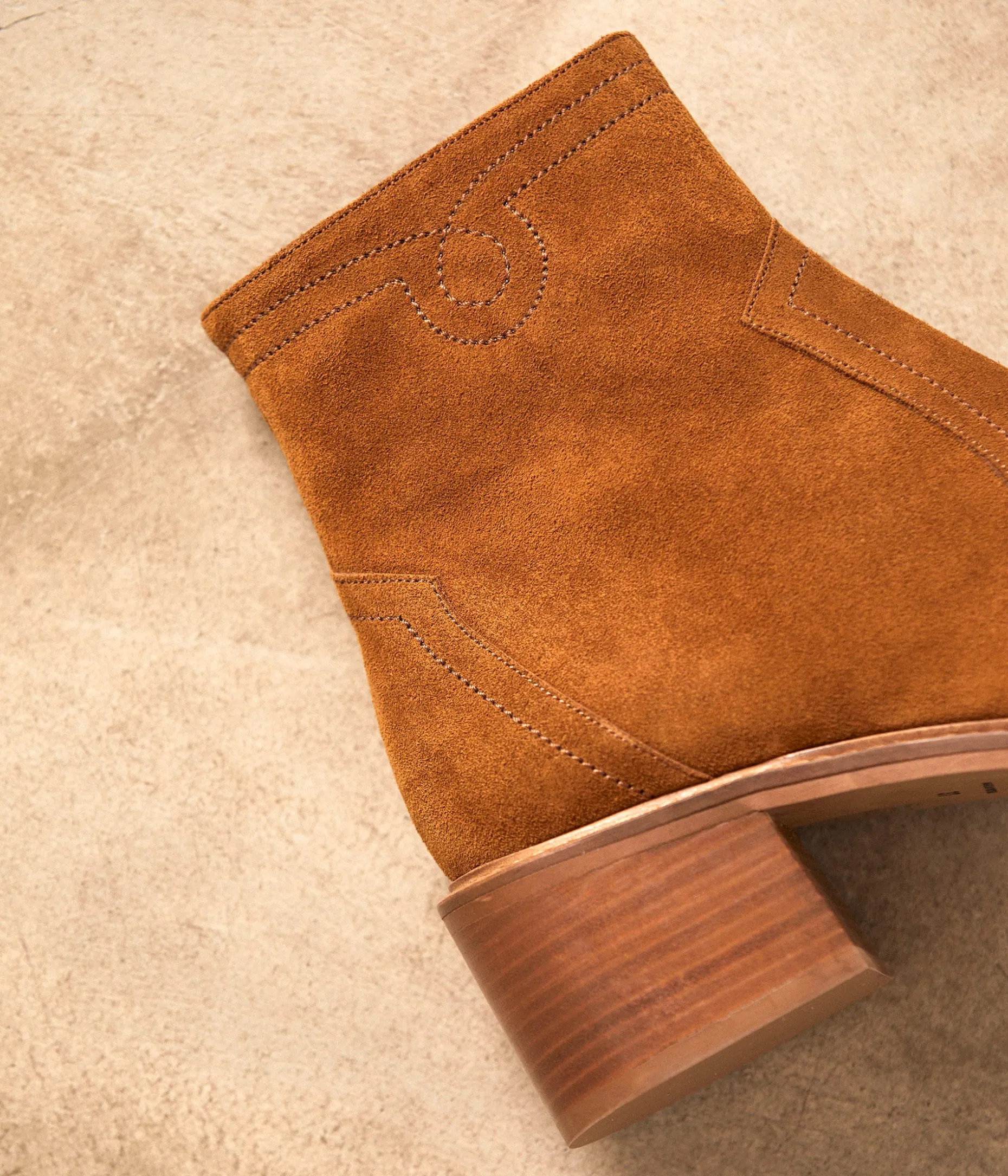 Le blanc + beige : le duo se débarrasse de son image ‘boring’, à condition de le bousculer avec du sportswear. La preuve avec les boots Ann en cuir velours tabac, à talon, à décaler avec un sweat ou un jean cropped blanc.