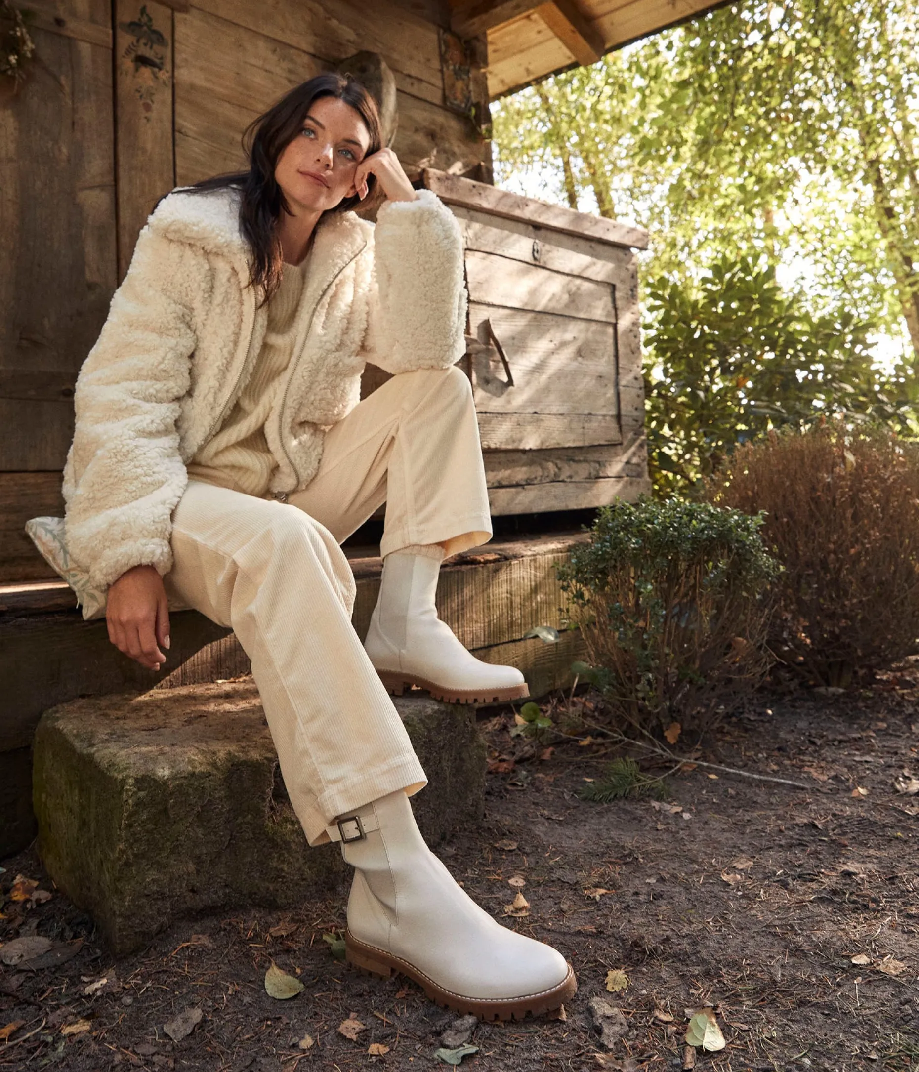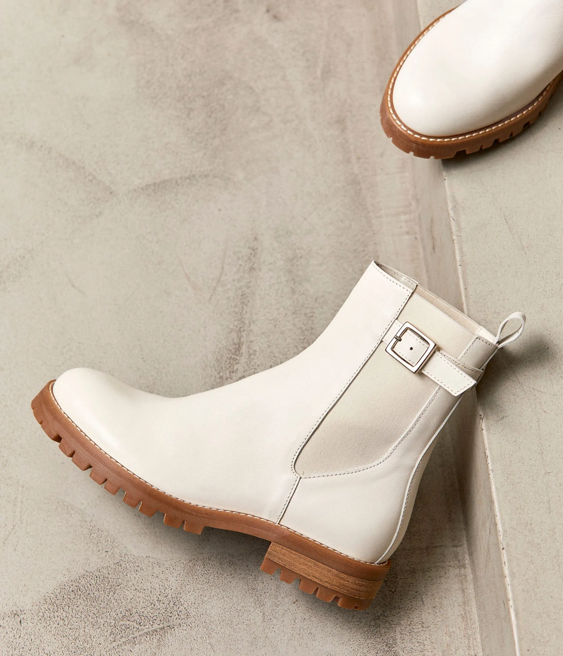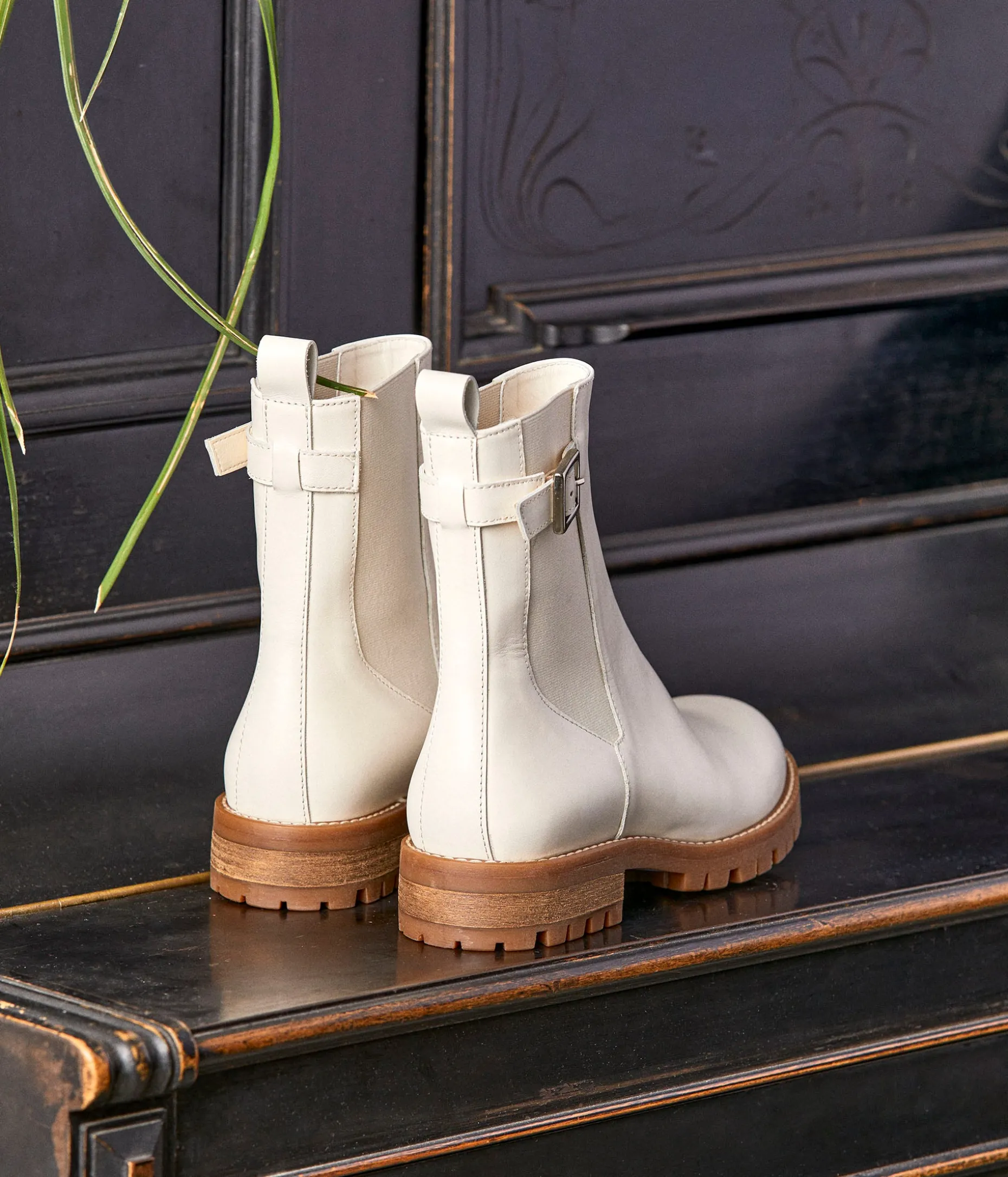Cuir lisse et semelle crantée : un désaccord parfait qui résonne comme une évidence. Succombez au charme des Chelsea boots Norma, déclinées en blanc d’hiver. Une ligne minimaliste cintrée d’une bride, pouvant s’illustrer par une seule devise : less is more.