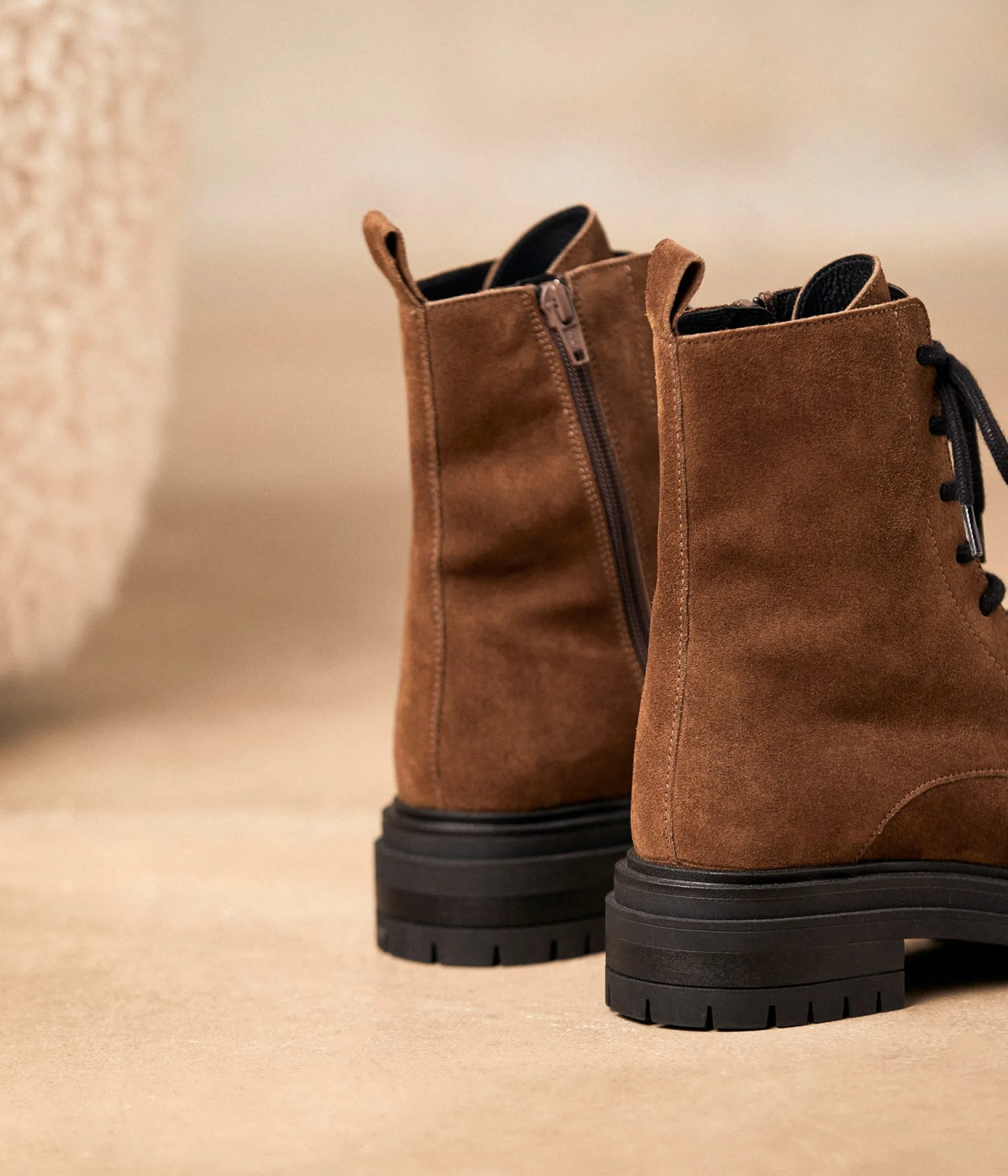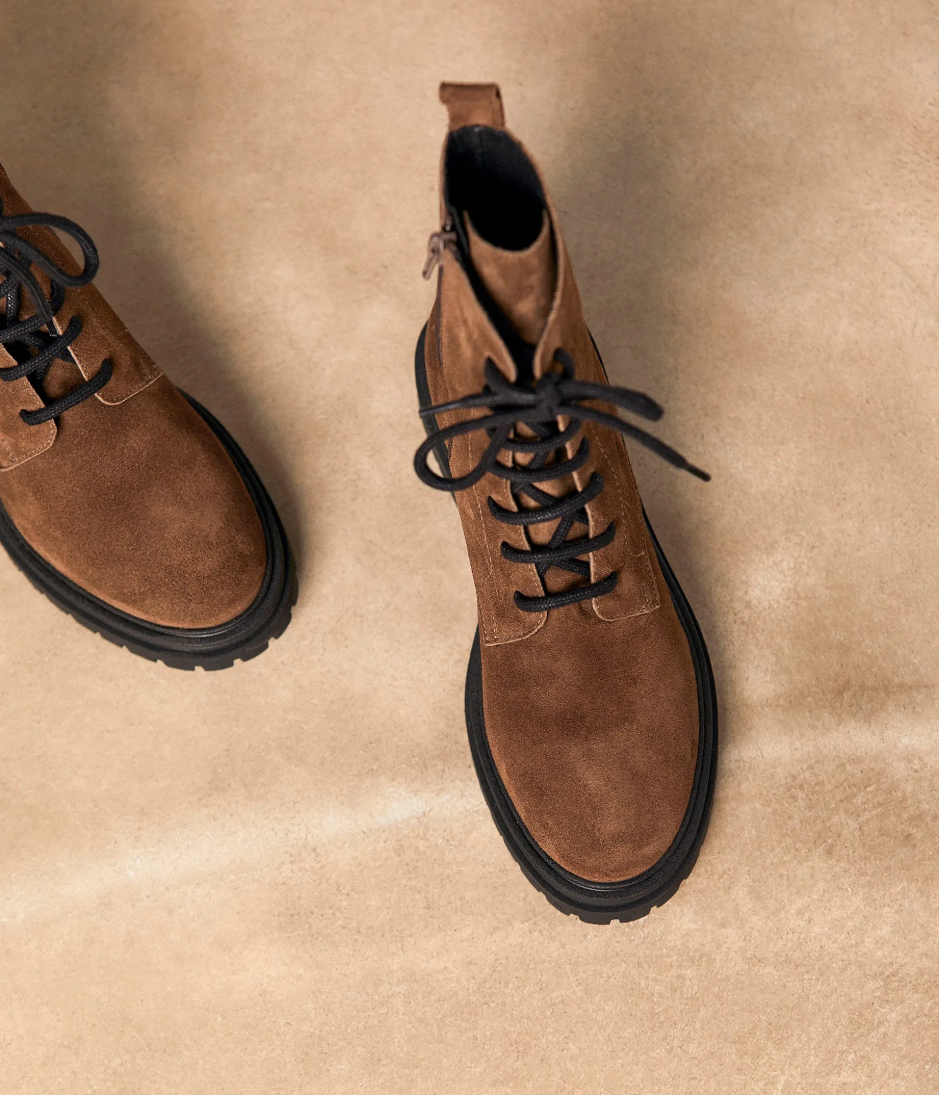 Bien moins casse-gueule que le stiletto-trop-haut, l’authenticité d’une bottine à lacet et semelle crantée a le don de rassurer l’allure. Voyez Aysha. Il suffit d’un manteau en peau lainée, d’un pull à col roulé, d’un pantalon en velours côtelé, pour qu’elles fassent la différence.