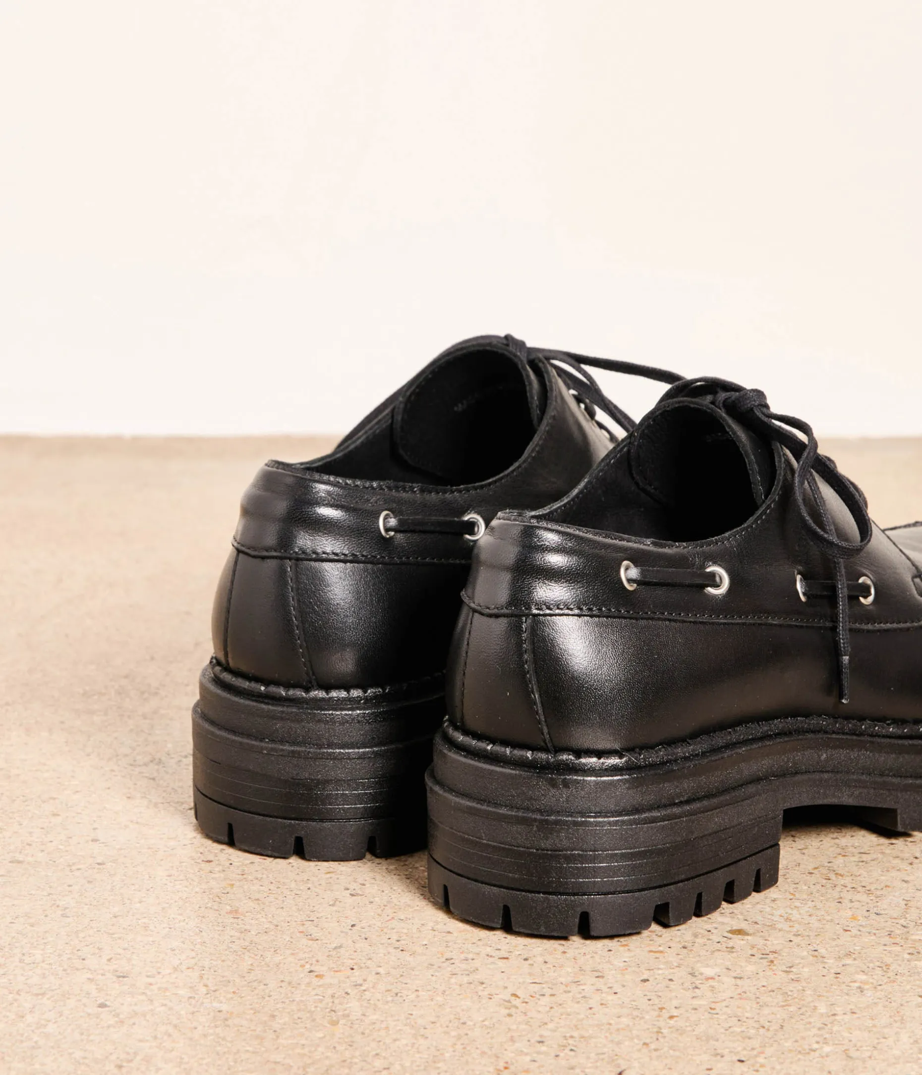 Un week-end à Londres. Un concert de rock. Un look ténébreux. Voilà ce que peut évoquer l’essayage des derbies Éric. En cuir noir, ils sont montés sur semelles crantées et défendent un je-ne-sais-quoi à la fois audacieux et impertinent (comme vous !)
