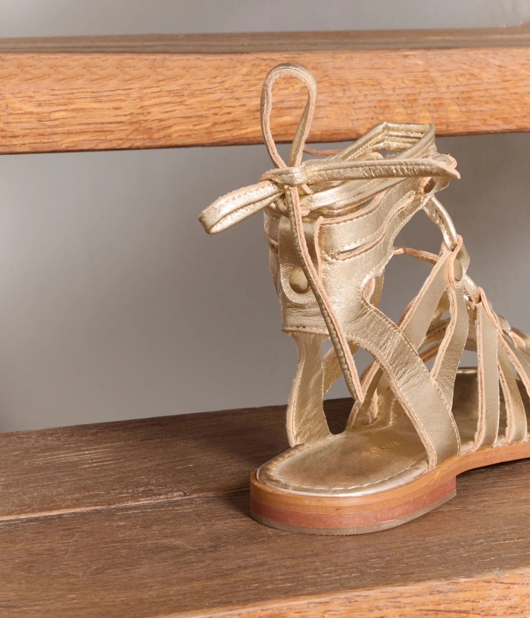 Hello, le soleil brille, brille, brille ! Un concurrent de taille pour les sandales-spartiates Golda en cuir doré. On valide leur jeu de brides multiples, pour en profiter jusqu’au bout des orteils.